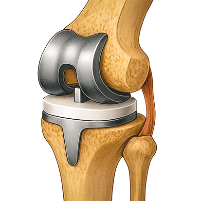 A total knee replacement replaces the worn femur, tibia, and often patella with smooth, medical‑grade implants that glide without grinding.